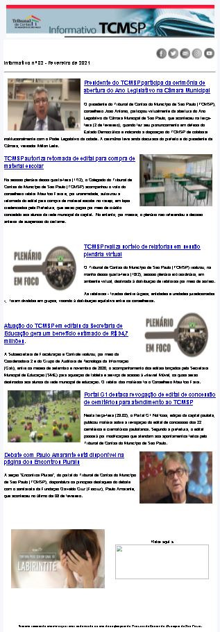 O presidente do Tribunal de Contas do Município de São Paulo (TCMSP), conselheiro João Antonio, participou virtualmente da abertura do Ano Legislativo da Câmara Municipal de São Paulo, que aconteceu na terça-feira (2 de fevereiro), quando fez seu pronunciamento em defesa do Estado Democrático e indicando a disposição do TCMSP de colaborar institucionalmente com o Poder Legislativo da cidade. A cerimônia teve ainda discursos do prefeito e do presidente da Câmara, vereador Milton Leite.