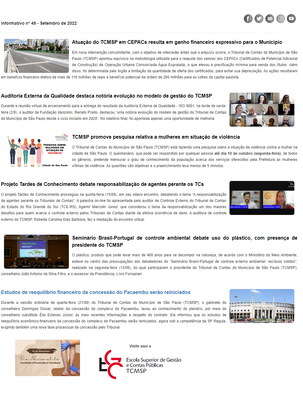 Durante a reunião virtual de encerramento para a entrega do resultado da Auditoria Externa de Qualidade - ISO 9001, na tarde de sexta-feira (2/9), o auditor da Fundação Vanzolini, Renato Prado, destacou “uma notória evolução do modelo de gestão do Tribunal de Contas do Município de São Paulo desde o ciclo iniciado em 2020”. No relatório final, foi apontada apenas uma oportunidade de melhoria.