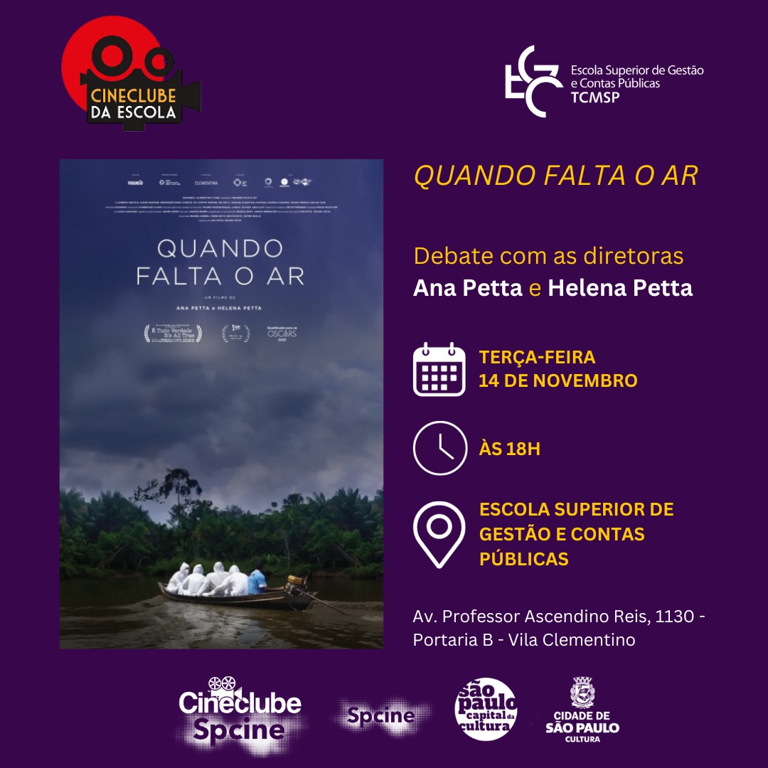Na próxima terça-feira, dia 14/11, às 18 horas, o filme nacional “Quando Falta o Ar” será a atração do Cineclube da Escola Superior de Gestão e Contas Públicas (EGC), do Tribunal de Contas do Município de São Paulo (TCMSP). A apresentação gratuita acontece no auditório da EGC e integra o projeto Cineclube Spcine, da Empresa de Cinema e Audiovisual de São Paulo, ligada à Secretaria Municipal de Cultura..