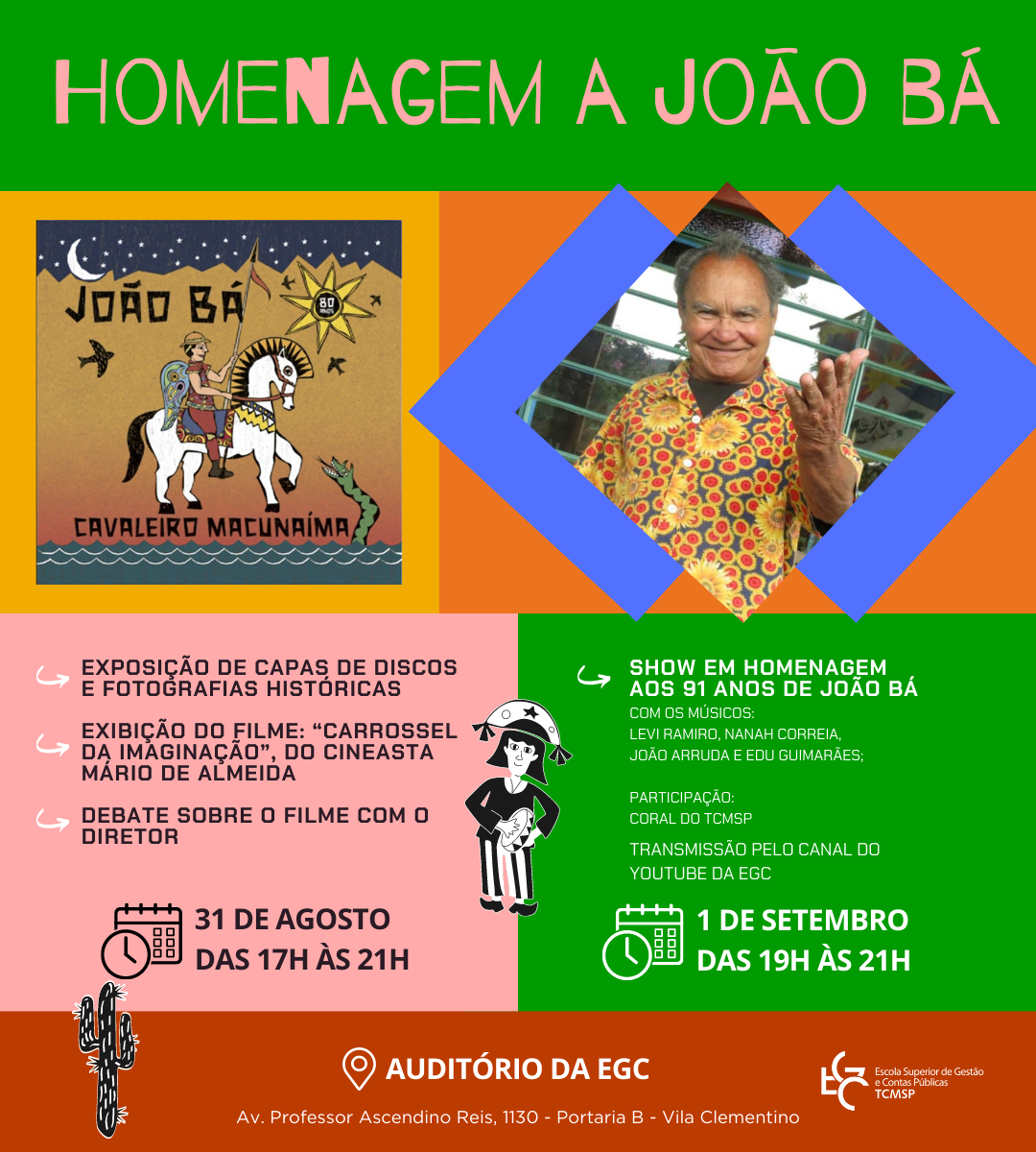 A homenagem continua em 1º de setembro, no próprio auditório da Escola de Gestão e Contas, com um show da banda composta por João Arruda, Levi Ramiro, Nanah Correia e Edu Guimarães, a partir das 19 horas, em celebração aos 91 anos do nascimento de João Bá. O grupo acompanhou o compositor na gravação do disco “Cavaleiro Macunaíma – João Bá 80 anos”. Este evento contará ainda com a participação do Coral do TCMSP e terá transmissão ao vivo pelo canal da EGC no Youtube.