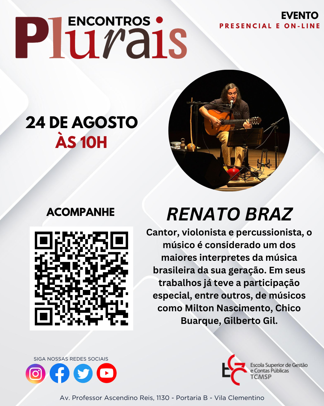 O programa Encontros Plurais, iniciativa da Escola Superior de Gestão e Contas (EGC) do Tribunal de Contas do Município de São Paulo (TCMSP), entrevistará em 24 de agosto, às 10 horas, o cantor, violonista e percussionista paulistano Renato Braz, considerado um dos maiores intérpretes da música popular brasileira de seu tempo, com reconhecimento de crítica e público.