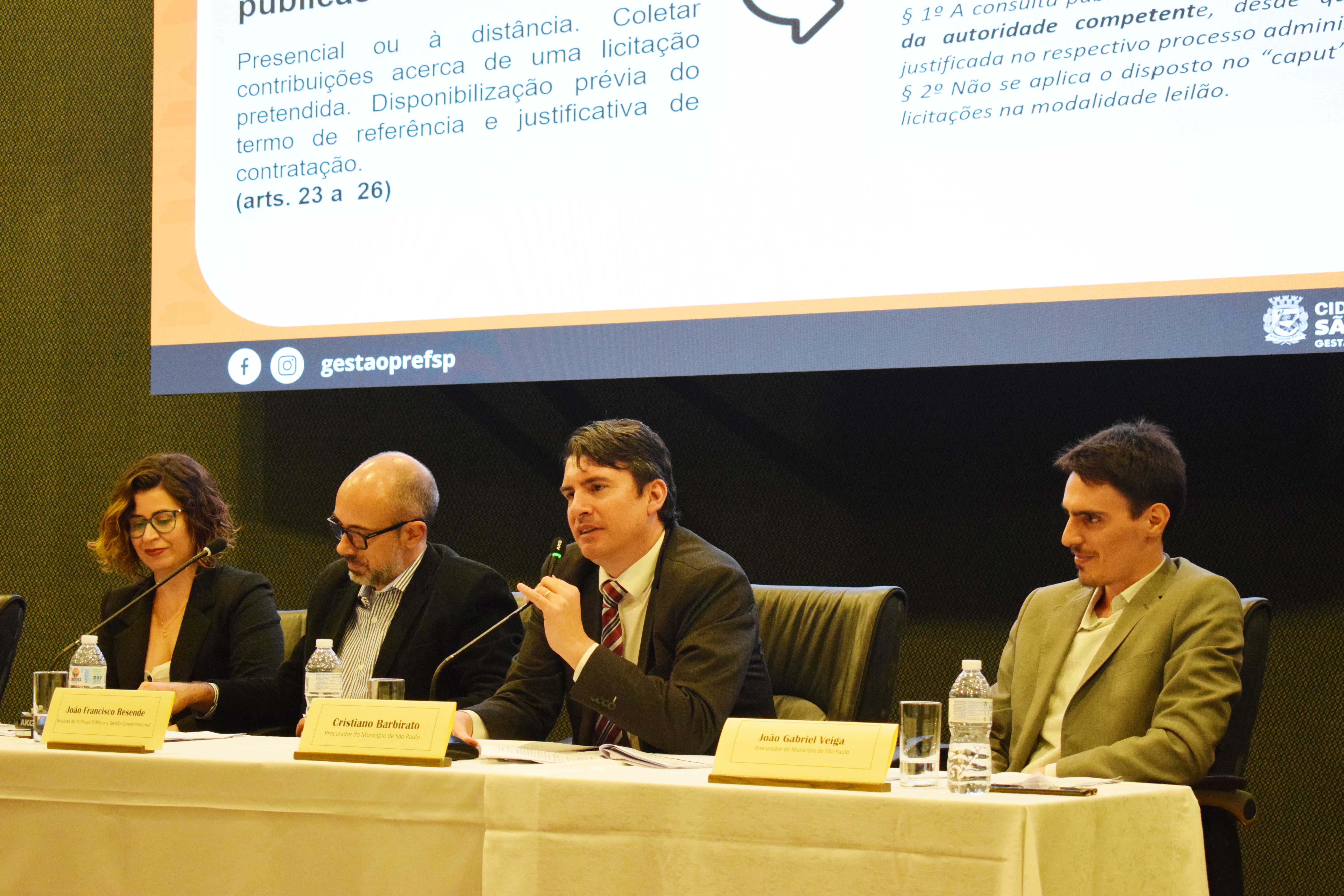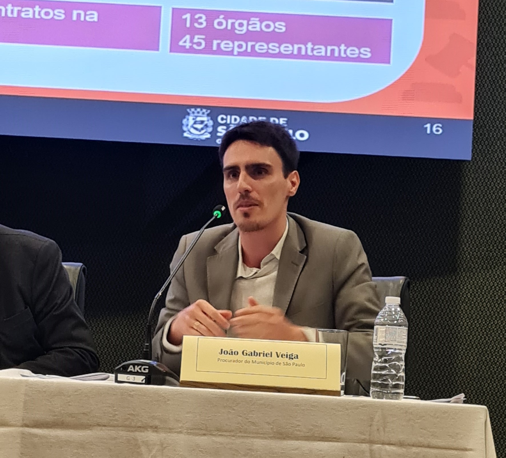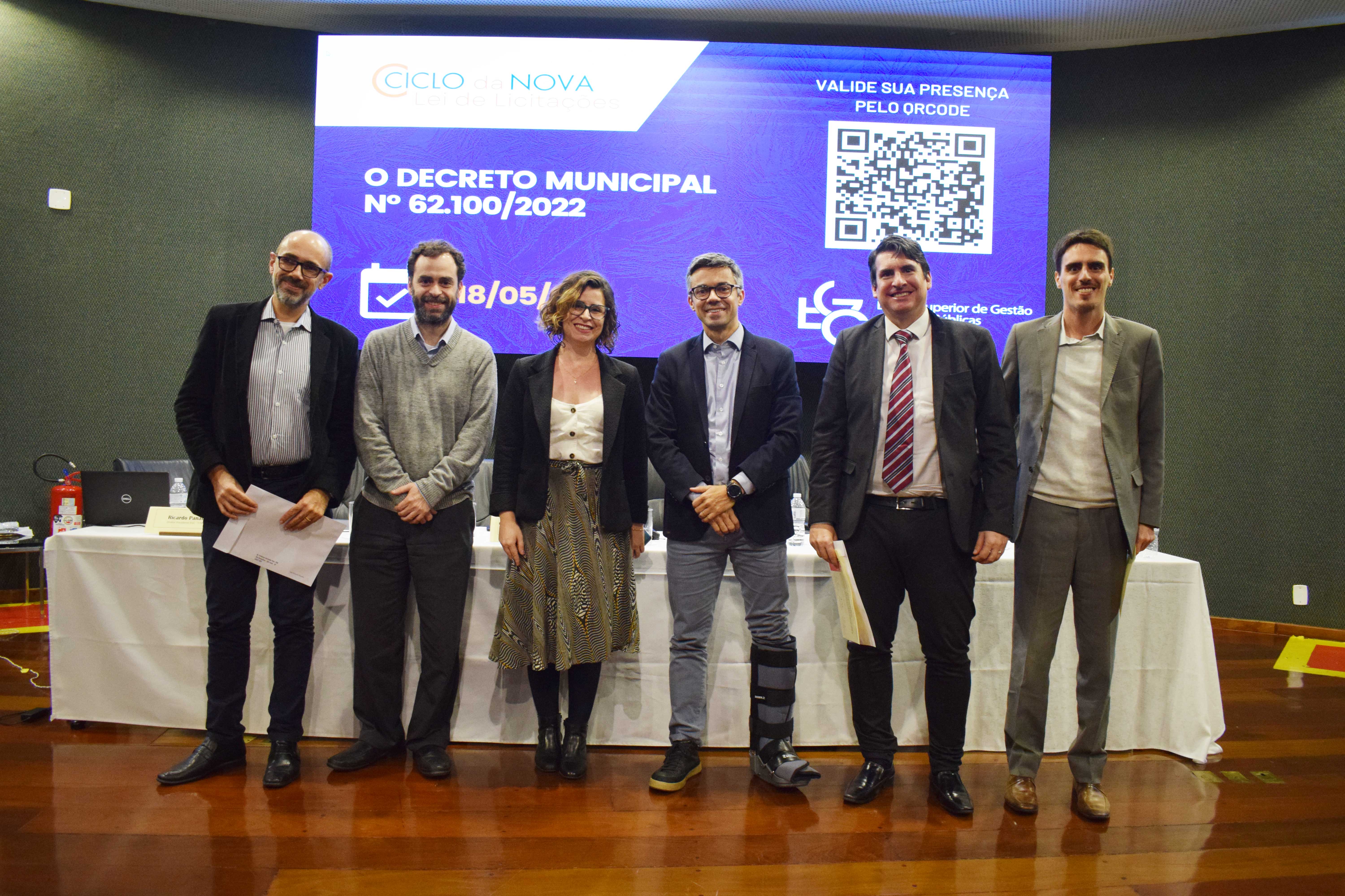 O diretor-presidente da EGC, Ricardo Panato, fez a mediação entre o procurador do município de São Paulo, Cristiano Barbirato, a analista de Políticas Públicas e Gestão Governamental (APPGG) da Prefeitura Municipal de São Paulo, Cassiana Montesiao de Souza, o também analista da APPGG, João Francisco Resende, o procurador João Gabriel Veiga, e o coordenador de Bens e Serviços (COBES) da Secretaria Municipal de Gestão (SMG), João Paulo Grecco, que fizeram as exposições.