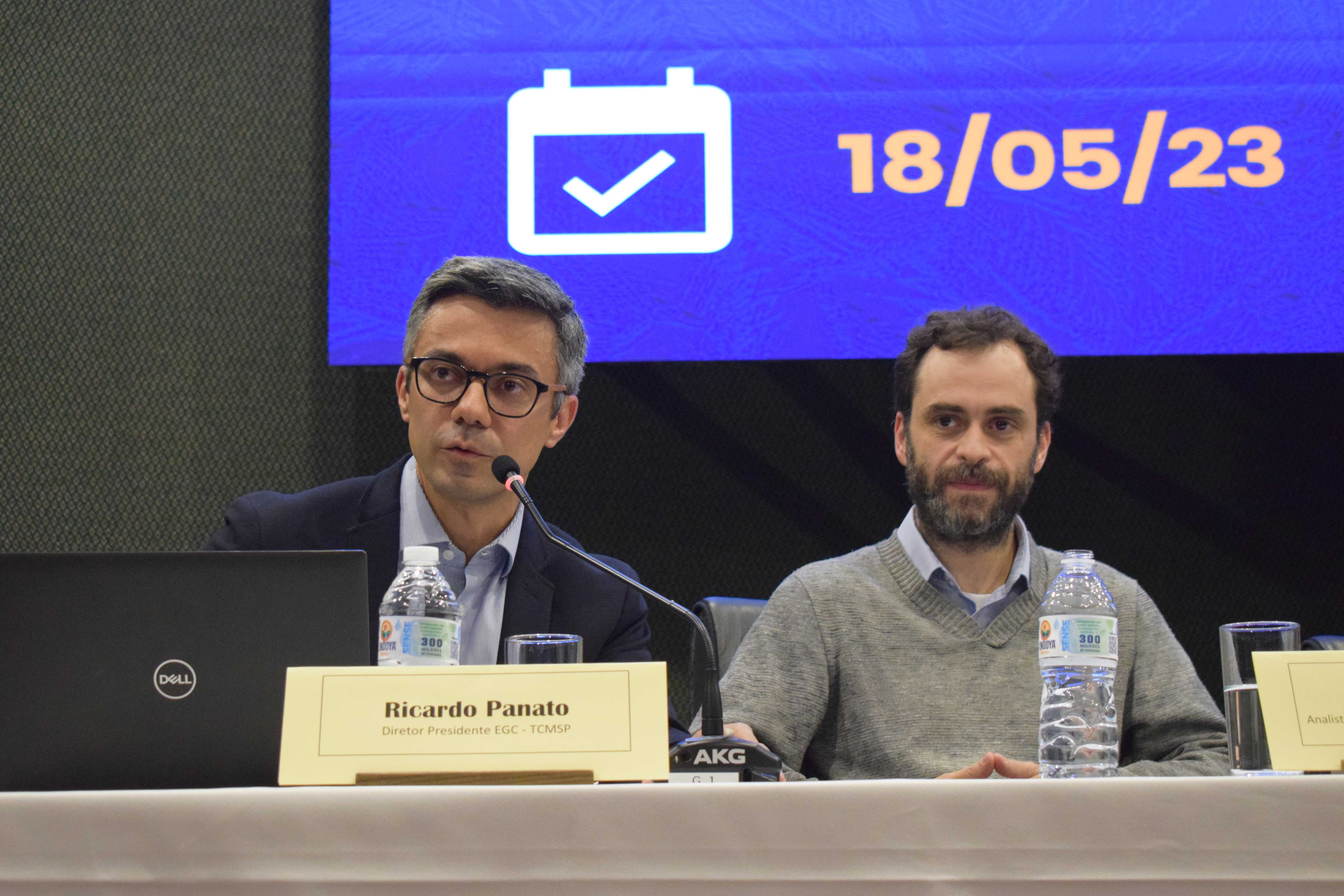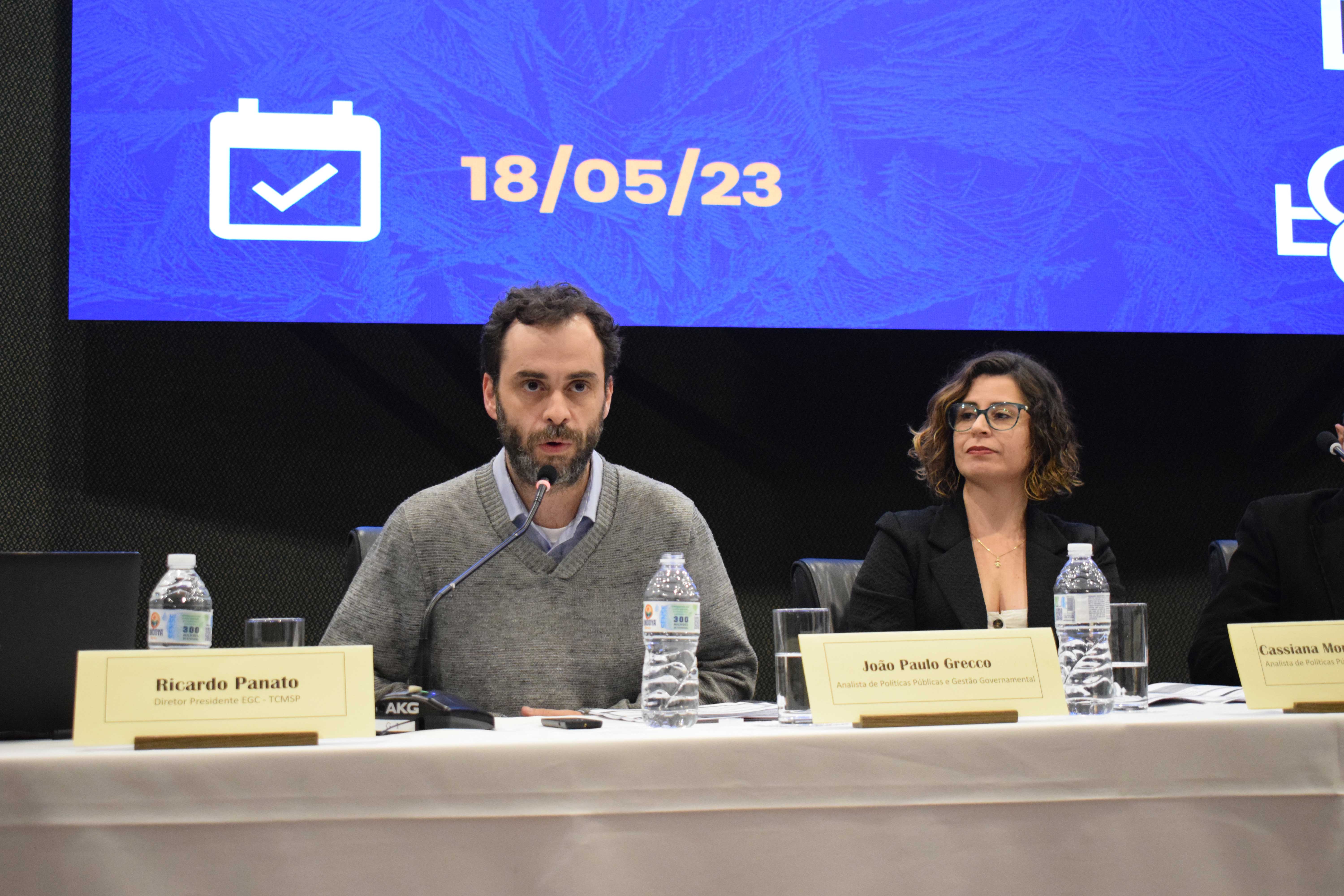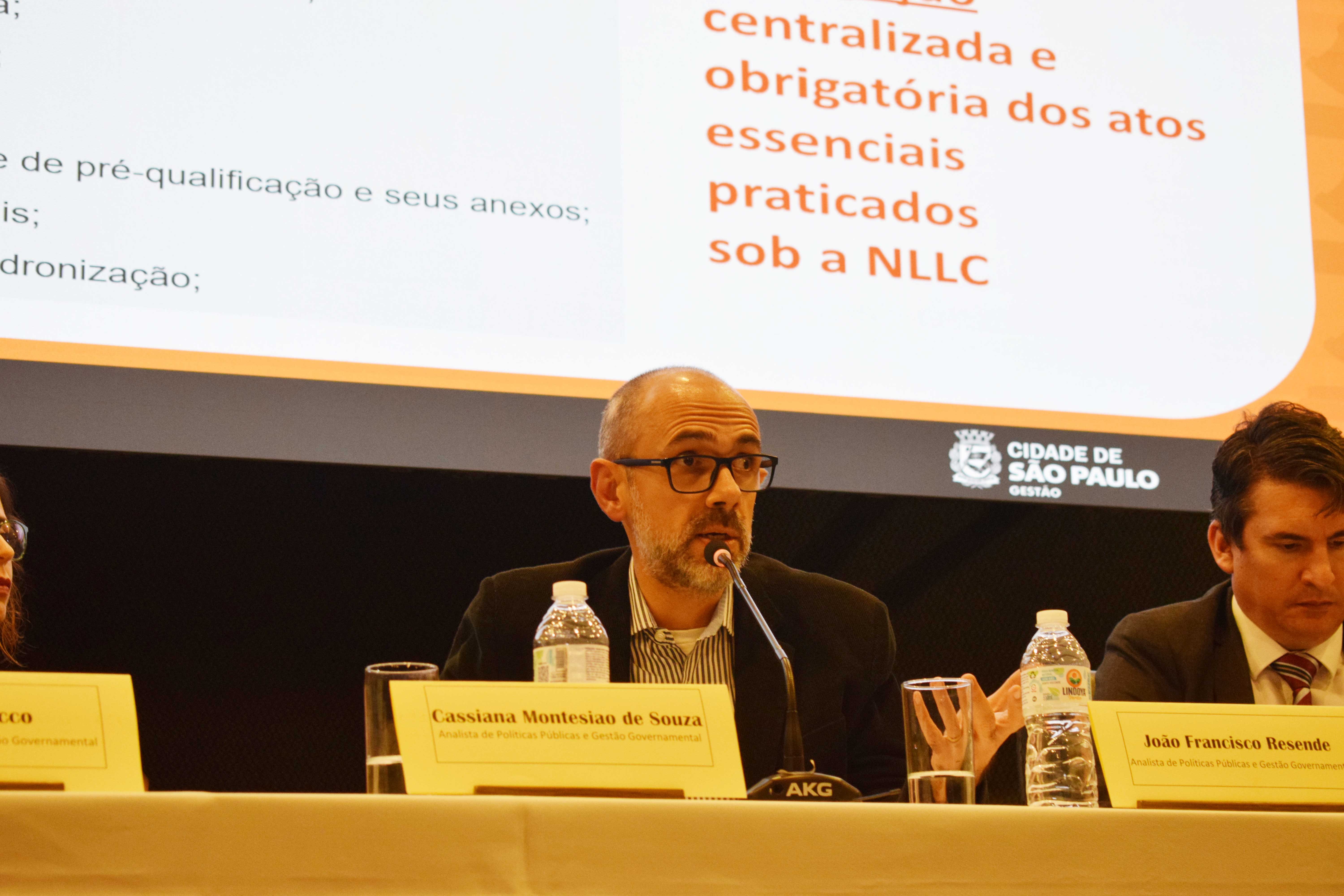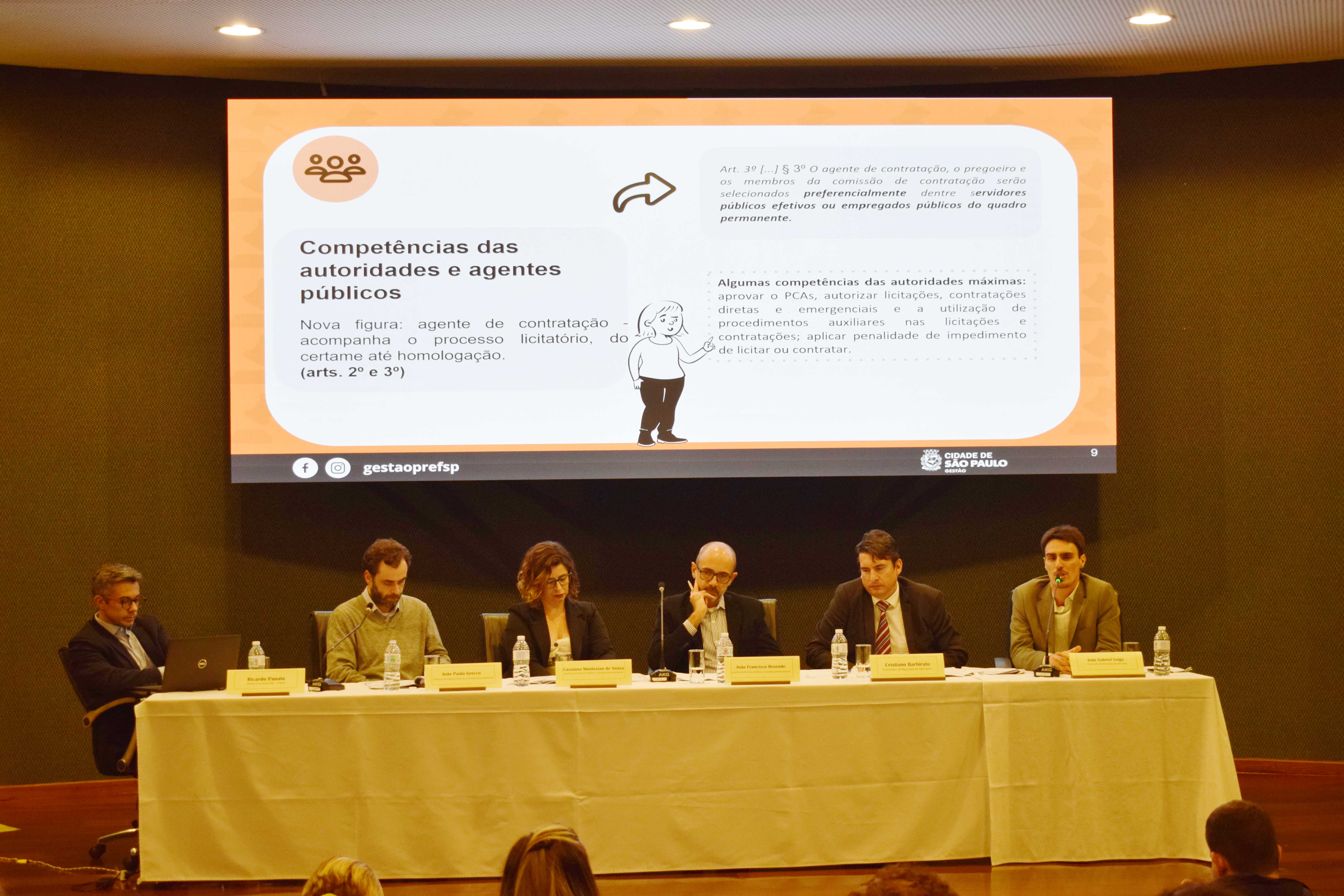 O diretor-presidente da EGC, Ricardo Panato, fez a mediação entre o procurador do município de São Paulo, Cristiano Barbirato, a analista de Políticas Públicas e Gestão Governamental (APPGG) da Prefeitura Municipal de São Paulo, Cassiana Montesiao de Souza, o também analista da APPGG, João Francisco Resende, o procurador João Gabriel Veiga, e o coordenador de Bens e Serviços (COBES) da Secretaria Municipal de Gestão (SMG), João Paulo Grecco, que fizeram as exposições.