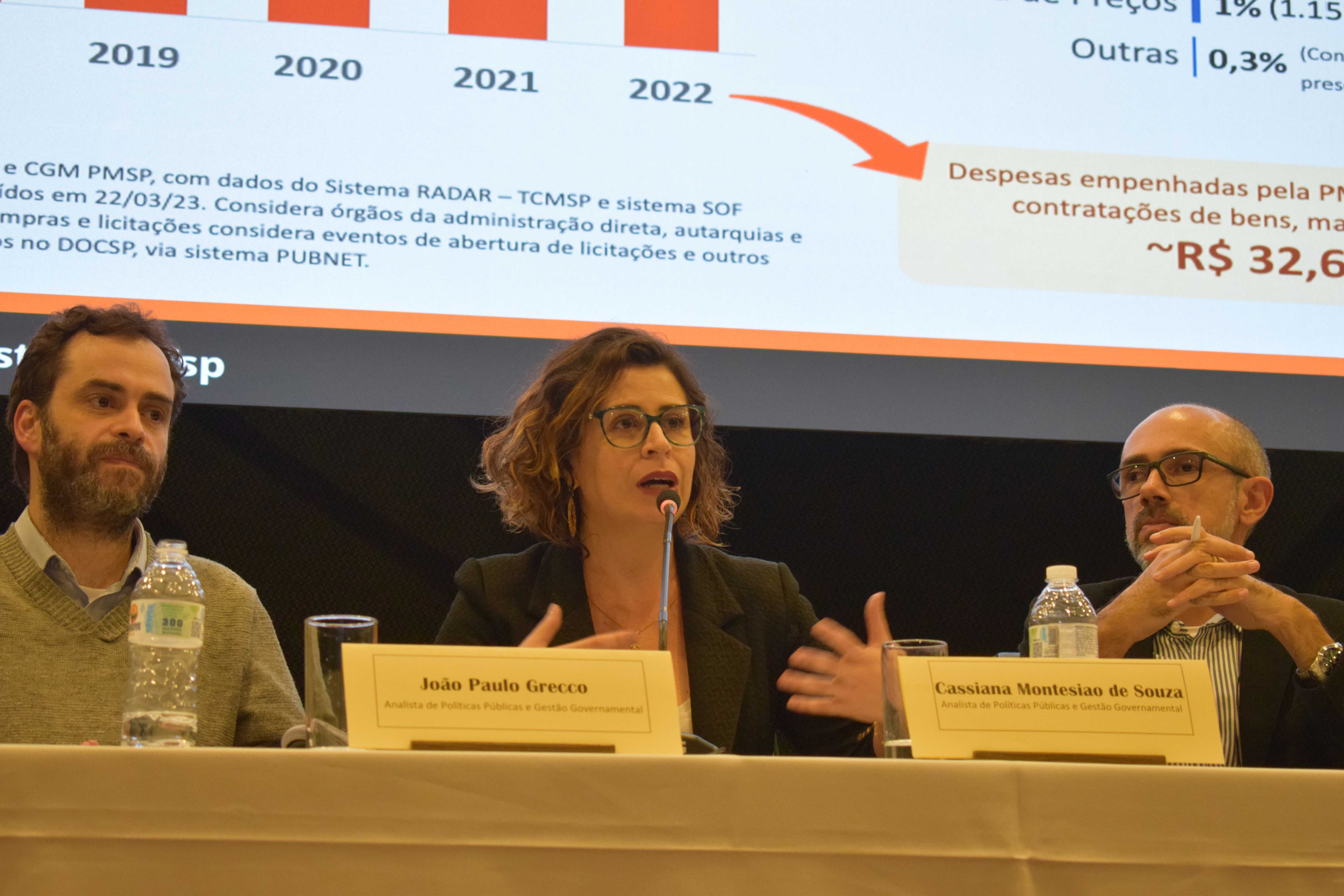 Grecco foi o primeiro dos palestrantes e trouxe um breve histórico da regulamentação da Lei nº 14.133/2021 (nova Lei de Licitações), além de mostrar como é feita a capacitação em compras públicas na Prefeitura. "Já fizemos uma série de encontros virtuais, são cinco até agora, tem mais ou menos trezentos servidores, em média, por encontro. A gente fez um workshop lá na Prefeitura sobre a nova Lei de Licitações com diversos palestrantes, procuradores do Tribunal de Contas do Estado de São Paulo (TCE-SP), do TCMSP, com 215 participantes, 25 palestrantes. [...] Fizemos um teste assistido também do ComprasGov Contratos, que é um módulo de gestão e fiscalização de contratos do ComprasGov, que 13 órgãos da Prefeitura participaram com 45 representantes", contou o coordenador de Bens e Serviços da SMG.