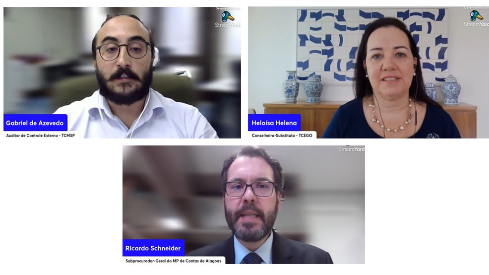 O auditor de Controle Externo do TCMSP, Gabriel de Azevedo, foi o mediador e conversou com a conselheira substituta do Tribunal de Contas do Estado de Goiás (TCE-GO), Heloísa Helena Godinho, e com o procurador de contas do Tribunal de Contas do Estado de Alagoas (TCE-AL), Ricardo Schneider.