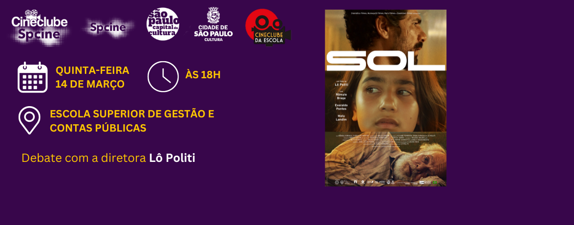 Anote na agenda: na quinta-feira (14/03), às 18 horas, o Cineclube da Escola de Gestão e Contas Públicas (EGC) exibe o filme “Sol”, da diretora Lô Politi, com Rômulo Braga, Everaldo Pontes e Malu Landim no elenco. É a primeira sessão do Cineclube neste ano.