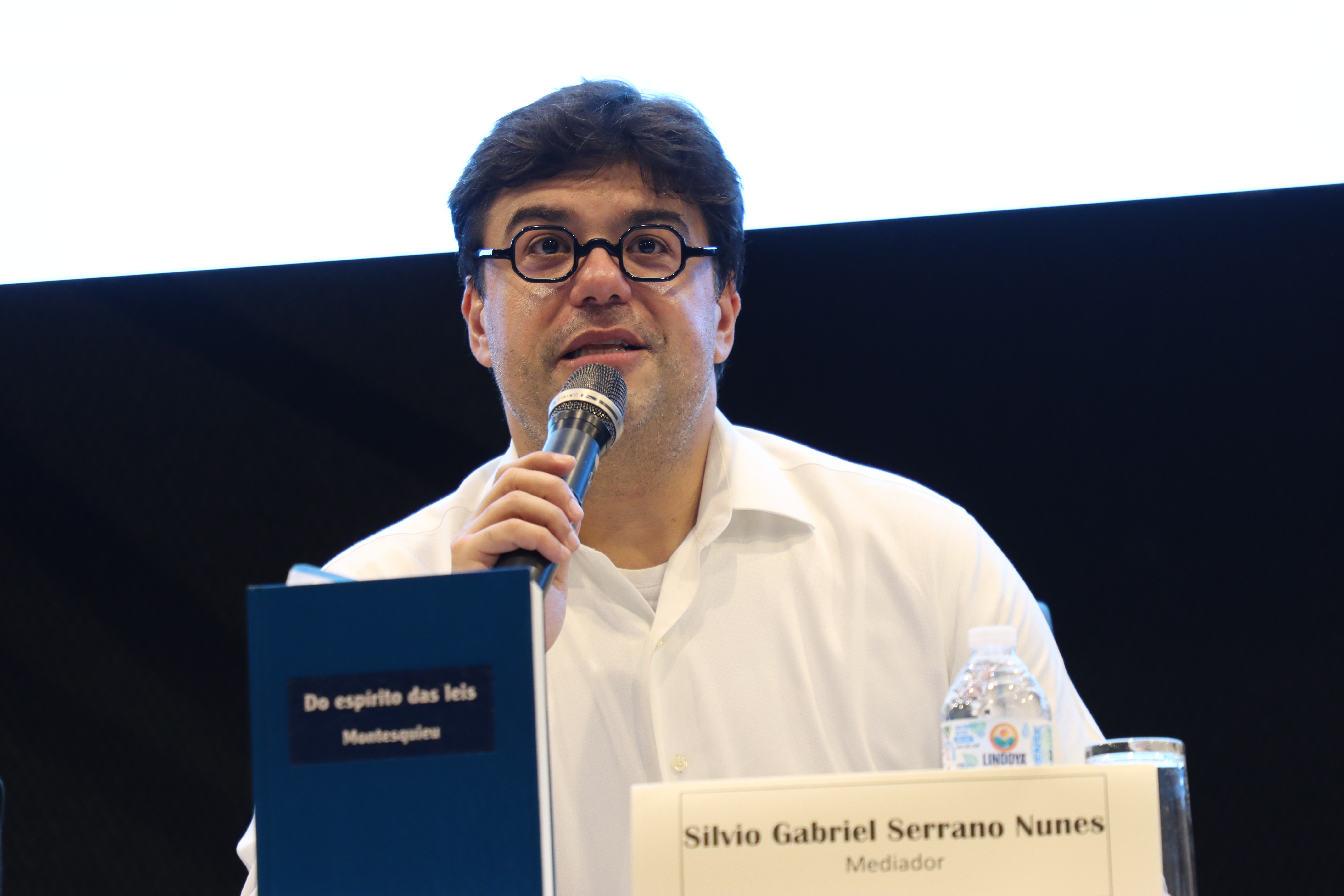 O primeiro palestrante a se apresentar foi o professor Thiago Vargas, que contextualizou os fatos históricos que levaram o filósofo Montesquieu a escrever, em 1748, o seu livro mais conhecido, “Do Espírito das Leis”. Vargas ainda narrou como a obra foi recebida pelos contemporâneos do autor francês e as repercussões que suas ideias desencadearam até muito tempo depois em todo o mundo, chegando até os dias atuais.