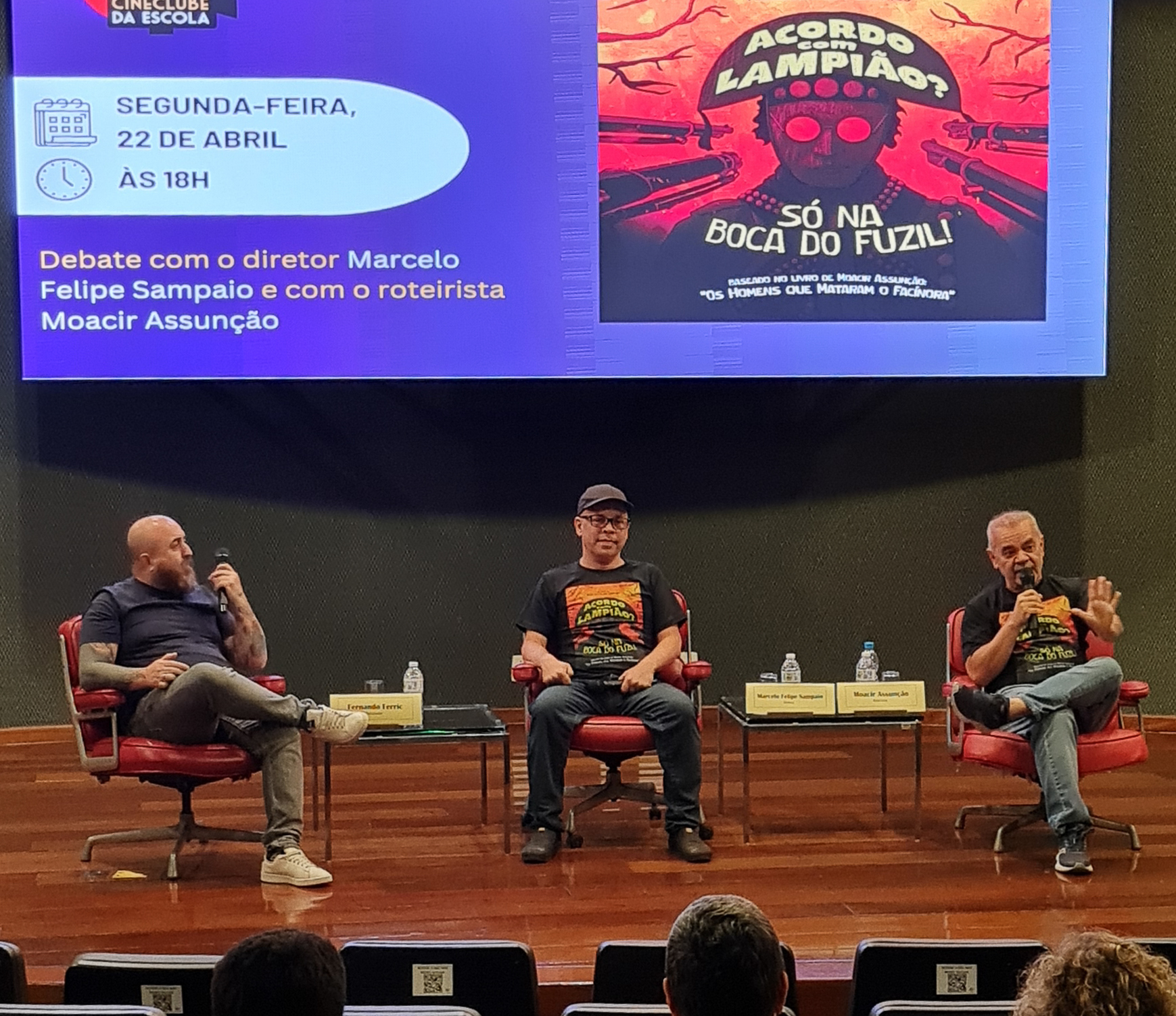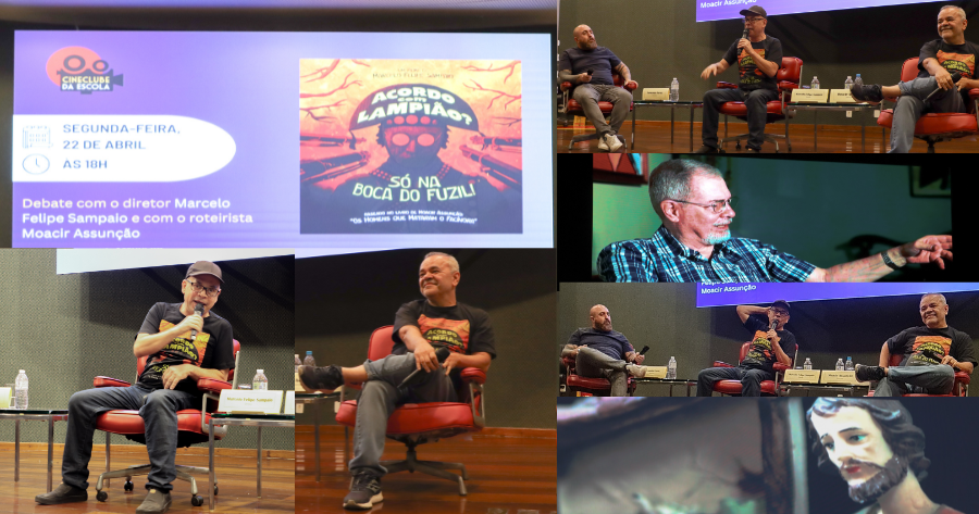 O auditório da Escola Superior de Gestão e Contas Públicas (EGC) se transformou em sala de cinema para exibir o documentário “Acordo com Lampião? Só na boca do fuzil”. Lançado neste mês de abril de 2024, o filme foi apresentado gratuitamente pelo Cineclube da Escola, na noite de segunda-feira (22/04). Após a exibição, o público participou de intenso debate, com uma hora de duração, reunindo o diretor Marcelo Felipe Sampaio e o roteirista Moacir Assunção.