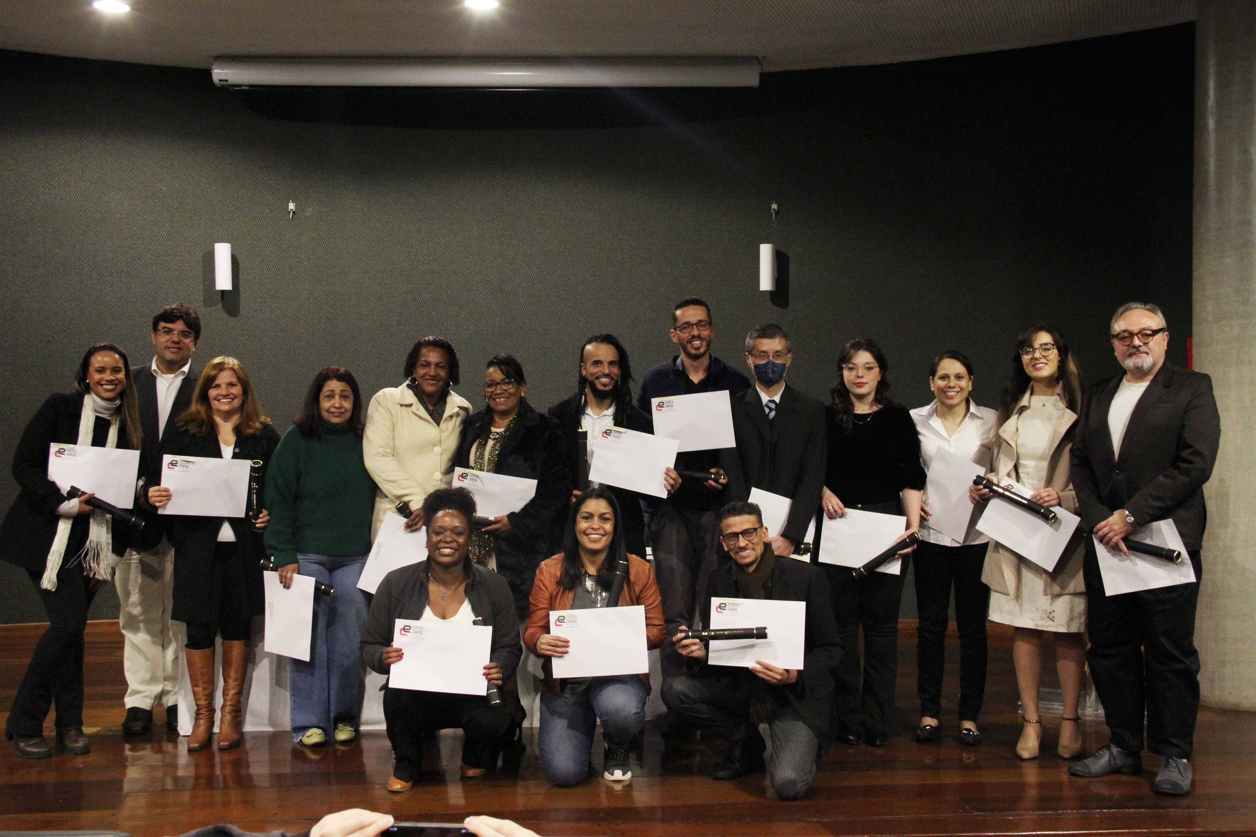 Foram entregues, na noite de segunda-feira (05/09), os certificados de conclusão do curso de pós-graduação em Formação Política do Estado (Turma 715-002), da Escola Superior de Gestão e Contas Públicas (EGC) do Tribunal de Contas do Município de São Paulo (TCMSP). O curso, conduzido integralmente na modalidade on-line, reuniu 25 alunos. Desses, 15 receberam o certificado no evento, que contou com a presença de seus convidados.