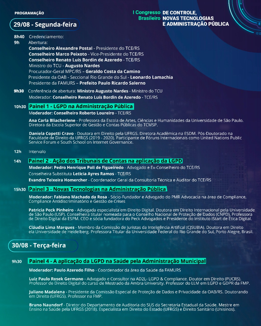Participariam o advogado da área de compliance Luiz Paulo Rosek Germano, Juliano Madalena, presidente da comissão de proteção aos dados da Ordem dos Advogados do Brasil – seção Rio Grande do Sul, e Bruno Naundorf, diretor do departamento de auditoria no Serviço Único de Saúde (SUS) da Secretaria Estadual de Saúde. Ainda participaram do evento o ministro do Tribunal de Contas da União (TCU), Augusto Nardes, e o presidente do TCE-RS, Alexandre Postal.