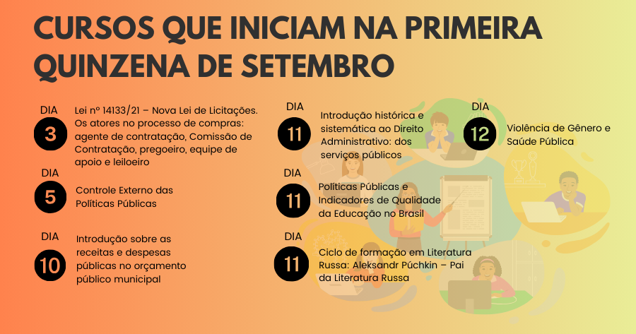 Setembro está chegando e a Escola Superior de Gestão de Contas Públicas reservou diversos cursos à sua escolha! Se você pretende se qualificar e conhecer melhor as políticas públicas e outros temas que envolvem a gestão dos recursos públicos, certamente vai se interessar por algum deles.