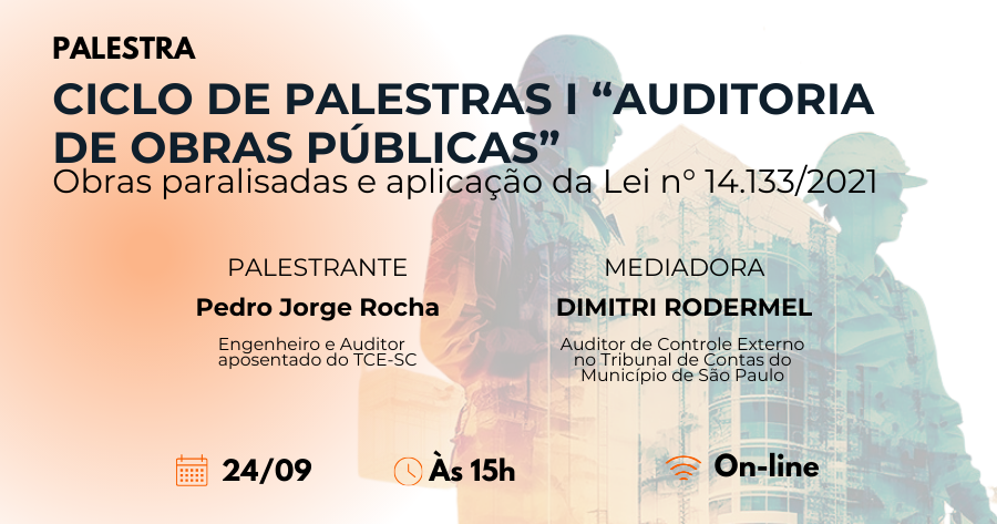 Iniciamos o ciclo pela palestra “Obras paralisadas e aplicação da Lei n° 14.133/2021”, que será conduzida por Pedro Jorge Rocha de Oliveira, referência na área de fiscalização de obras públicas. A Lei nº 14.133/2021, que instituiu novo regime de licitações e contratos administrativos, prevê inúmeros dispositivos relativos à continuidade de obras paralisadas e de aparatos jurídicos aplicáveis à conclusão de tais estruturas, e, para abordá-los, recebemos o auditor aposentado do TCE-SC.