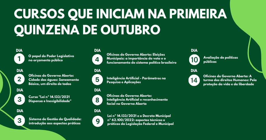 Nesta primeira quinzena de outubro, a Escola Superior de Gestão e Contas Públicas (EGC) do Tribunal de Contas do Município de São Paulo promove dez cursos, gratuitos e na modalidade on-line ou presencial.