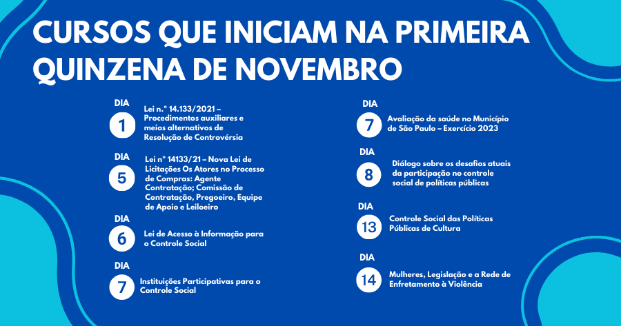 Nesta primeira quinzena de novembro de 2024, a Escola Superior de Gestão e Contas Públicas (EGC) do Tribunal de Contas do Município de São Paulo promove 07 cursos, gratuitos e na modalidade on-line.