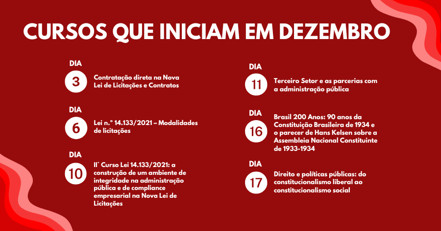 Antes do término do ano, a Escola Superior de Gestão e Contas ainda está oferecendo novos cursos, em dezembro, para aqueles que desejam ampliar seus conhecimentos na área de licitações, políticas e administração públicas, Direito e História.