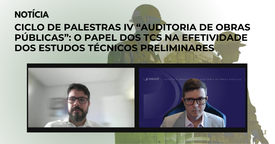 Nesta terça-feira (26/11), o quarto encontro virtual deste ano do Ciclo de Palestras sobre Auditoria de Obras Públicas abordou questões envolvendo o papel dos Tribunais de Contas na efetividade dos Estudos Técnicos Preliminares (ETPs). A iniciativa do seminário que reuniu especialistas e auditores foi da Escola de Gestão e Contas Públicas (EGC), vinculada ao Tribunal de Contas do Município de São Paulo. O evento teve apoio do Instituto Brasileiro de Auditoria de Obras Públicas (Ibraop) e realizado ao vivo, com transmissão pelo canal do YouTube da Escola.