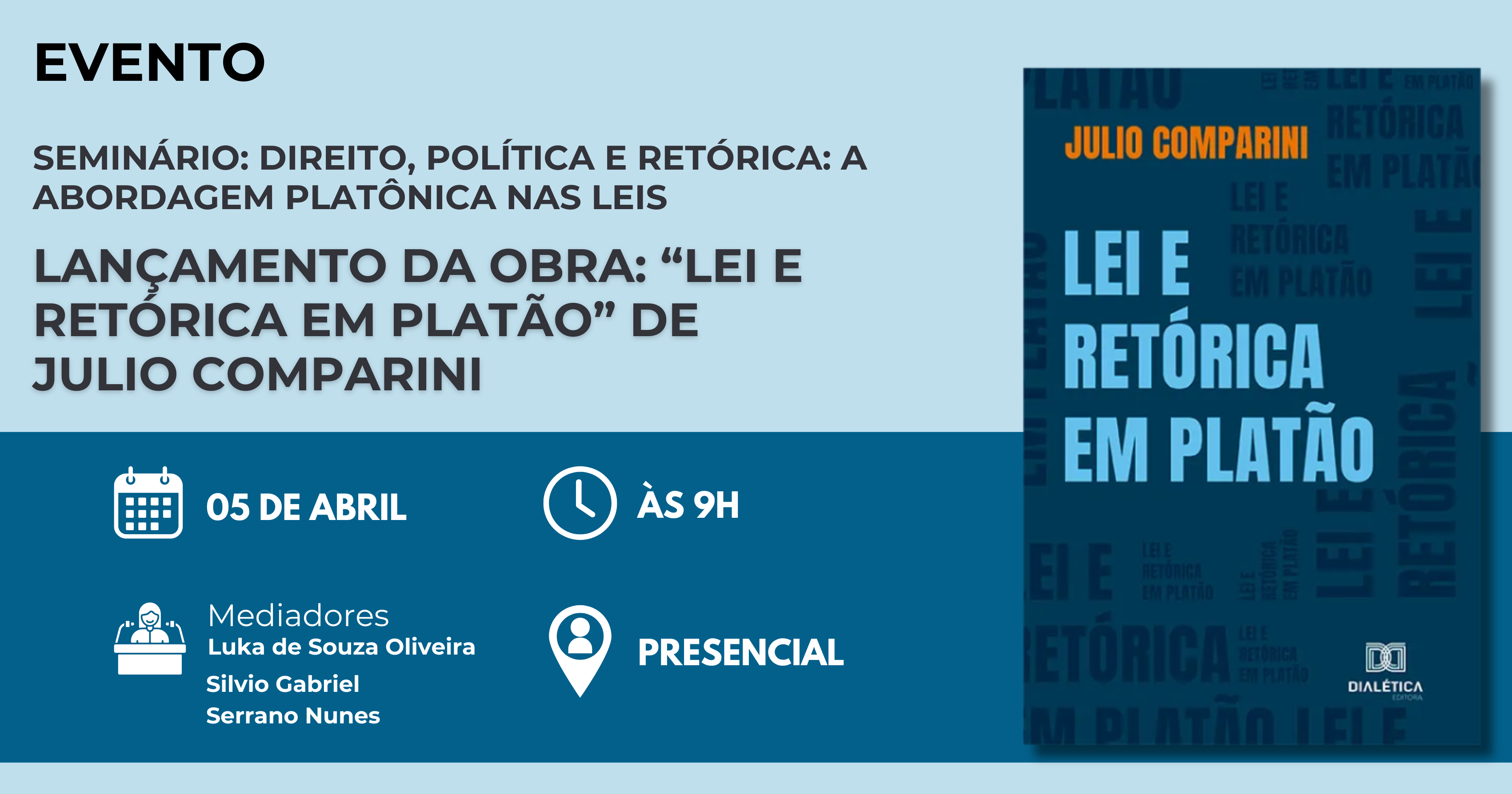 Na oportunidade, será lançado o livro Lei e retórica em Platão, de autoria do palestrante, publicado pela Editora Dialética.