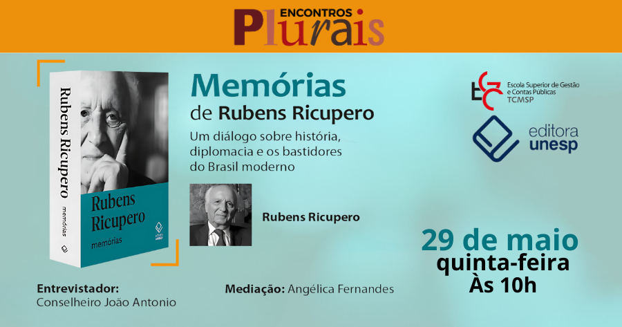 No próximo dia 29 de maio, das 10h às 12h, a nova edição do programa Encontros Plurais vai receber no palco do auditório da Escola Superior de Gestão e Contas (EGC) do Tribunal de Contas do Município de são Paulo o professor, diplomata e ex-ministro Rubens Ricupero, considerado um dos maiores analistas da política externa brasileira. O evento especial será na modalidade híbrida, com transmissão ao vivo pelos canais no Youtube da EGC e da Editora Unesp.