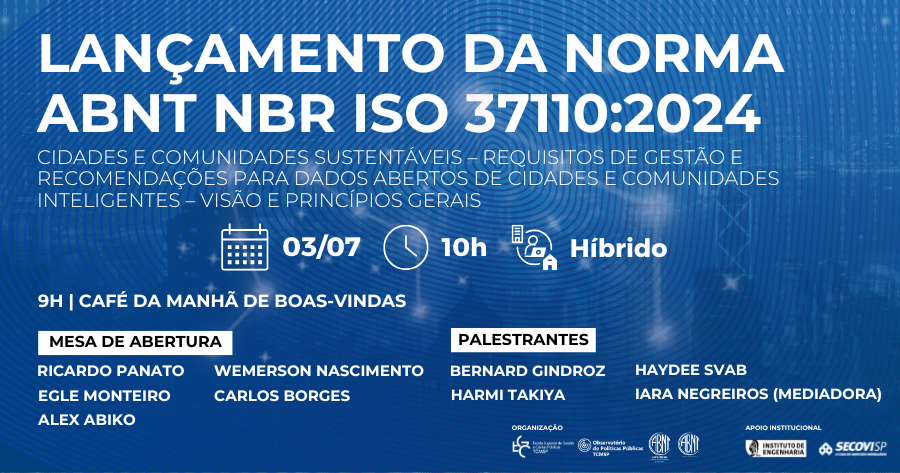Objetivo: Lançamento e divulgação da norma ABNT-ISO 37110: 2024. Requisitos de gestão e recomendações para dados abertos de cidades e comunidades inteligentes - visão e princípios gerais