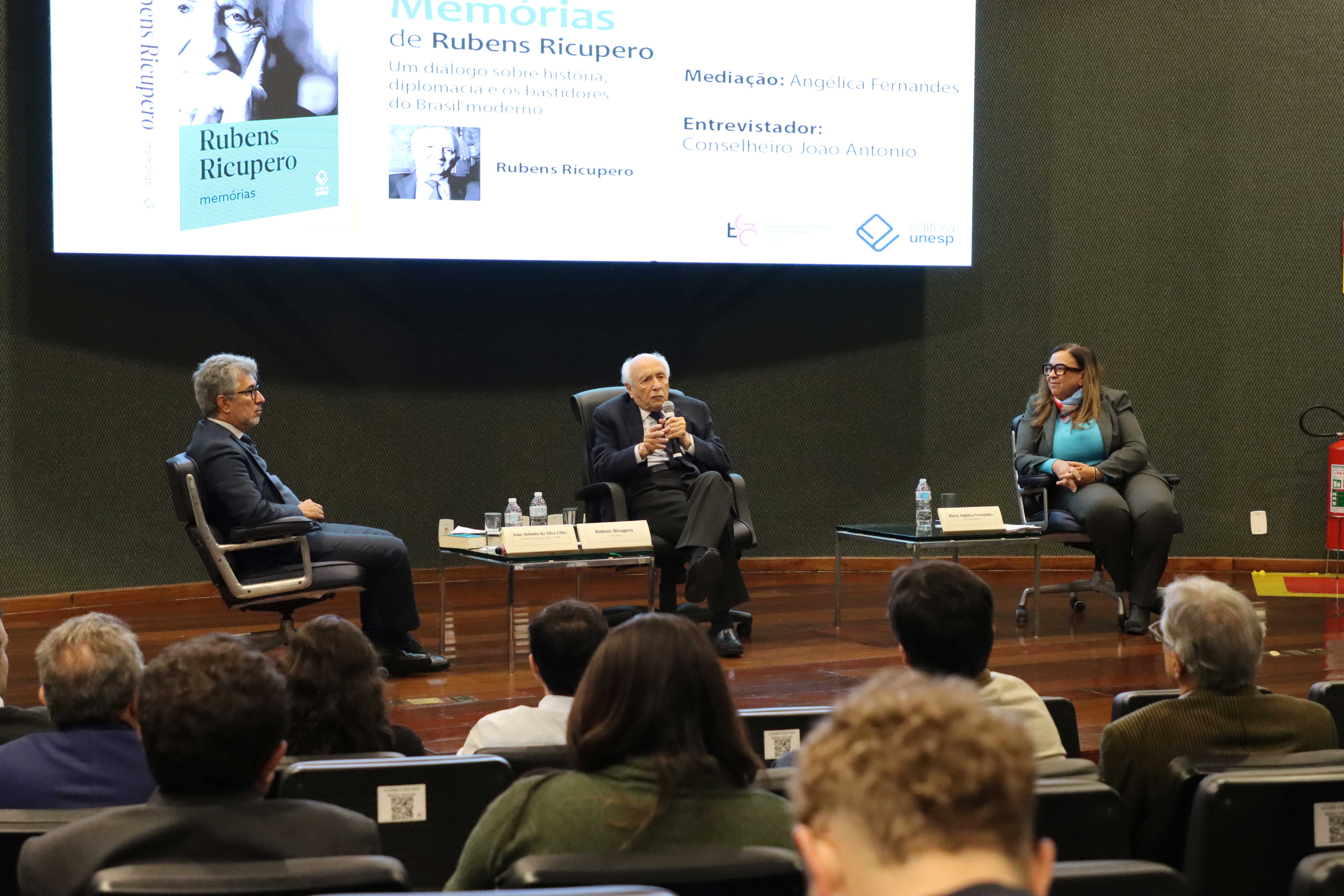 Com o tema "Memórias de Rubens Ricupero", o evento contou com entrevista conduzida pelo conselheiro do TCMSP, João Antonio, e pela jornalista e coordenadora do Grupo de Trabalho Gênero do Observatório de Políticas Públicas do TCMSP, Angélica Fernandes.