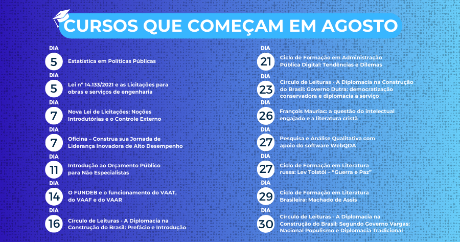 Confira aqui os cursos que estão com inscrições abertas e são oferecidos neste mês de agosto pela Escola Superior de Gestão e Contas Públicas (EGC), a Escola de Governo do Tribunal de Contas do Município de São Paulo.
