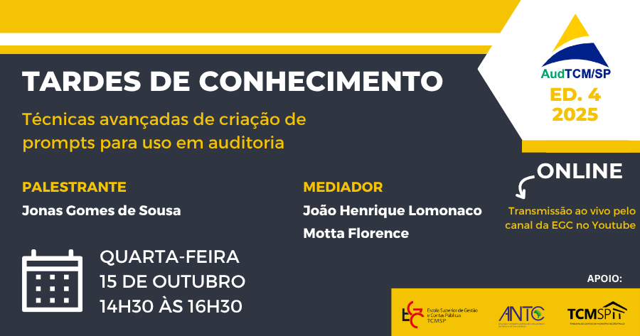 Na palestra, organizada em parceria com a AudTCM no programa “Tardes de Conhecimento”, serão apresentadas técnicas de criação de prompts, tais como cadeia de pensamento e estímulo de prompt direcional, com exposição de exemplos práticos do uso em auditorias. Serão abordados ainda os elementos essenciais que todo prompt eficaz deve conter, além de estratégias para evitar respostas imprecisas da inteligência artificial.