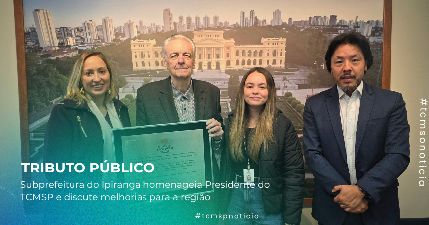 O Presidente do Tribunal de Contas do Município de São Paulo (TCMSP), Conselheiro Domingos Dissei, recebeu nesta segunda-feira (20) uma homenagem do Subprefeito do Ipiranga, Luis Felipe Miyabara, durante visita institucional em seu gabinete.