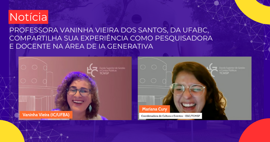 Para abrir o cronograma de aulas da Semana de Integração dos alunos da pós-graduação da Escola Superior de Gestão e Contas Públicas (EGC), a professora Vaninha Vieira dos Santos, da Universidade Federal da Bahia, apresentou em uma live, no canal da EGC no YouTube, a palestra intitulada “Uso ético e responsável da Inteligência Artificial Generativa: um guia para a pesquisa acadêmica”, na última quarta-feira (04/02).