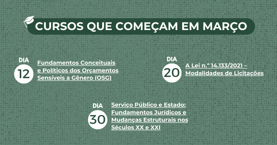 Estão abertas as inscrições para os cursos da Escola Superior de Gestão e Contas Públicas (EGC) neste mês de março. As aulas abordam assuntos variados e as inscrições são gratuitas.